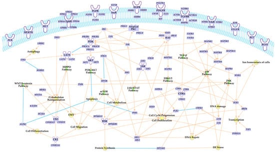 Drivers of cancer development within cellular kinome. The scheme represents established genes coding for protein kinases and their intracellular signaling roles, disruption of which is involved in chronic disease. The figure was compiled using information provided in the literature [,,,,,] as well as QIAGEN Ingenuity Pathway Analysis Knowledge Base. On the plasma membrane (top), there are tyrosine kinase and tyrosine kinase-like receptors, the activation of which initiates various signaling cascades depicted inside the cell. For simplification, only the driver genes are included in the figure; the relationship arrow lines indicate activation/causation (in light orange) or inhibition/suppression (in light blue); only the most prominent intracellular signaling pathways (in green) and cellular events associated with respective kinases (in yellow) are depicted. ABL1: ABL proto-oncogene 1, non-receptor tyrosine kinase; ABL2: ABL proto-oncogene 2, non-receptor tyrosine kinase; ACVR1: activin A receptor type 1; ACVR1B: activin A receptor type 1B; ACVR2A: activin A receptor type 2A; ACVR2B: activin A receptor type 2B; AKT1: AKT serine/threonine kinase 1; AKT3: AKT serine/threonine kinase 3; ALK: ALK receptor tyrosine kinase; ALPK2: alpha kinase 2; ARAF: A-Raf proto-oncogene, serine/threonine kinase; ATM: ATM serine/threonine kinase; ATR: ATR serine/threonine kinase; AURKA: aurora kinase A; BMPR2: bone morphogenetic protein receptor type 2; BRAF: B-Raf proto-oncogene, serine/threonine kinase; BRD4: bromodomain containing 4; BRSK1: BR serine/threonine kinase 1; CDK12: cyclin dependent kinase 12; CDK4: cyclin dependent kinase 4; CDK6: cyclin dependent kinase 6; CHEK2: checkpoint kinase 2; CSF1R: colony stimulating factor 1 receptor; CSNK1E: casein kinase 1 epsilon; CSNK1G3: casein kinase 1 gamma 3; CSNK2A1: casein kinase 2 alpha 1; DCLK1: doublecortin like kinase 1; DYRK1A: dual specificity tyrosine phosphorylation regulated kinase 1A; EGFR: epidermal growth factor receptor; EIF2AK3: eukaryotic translation initiation factor 2 alpha kinase 3; EPHA1: EPH receptor A1; EPHA2: EPH receptor A2; EPHA3: EPH receptor A3; EPHA4: EPH receptor A4; EPHA6: EPH receptor A6; EPHB2: EPH receptor B2; EPHB6: EPH receptor B6; ERBB2: erb-b2 receptor tyrosine kinase 2; ERBB3: erb-b2 receptor tyrosine kinase 3; ERBB4: erb-b2 receptor tyrosine kinase 4; FGFR1: fibroblast growth factor receptor 1; FGFR2: fibroblast growth factor receptor 2; FGFR3: fibroblast growth factor receptor 3; FLT3: fms related receptor tyrosine kinase 3; IGF1R: insulin like growth factor 1 receptor; JAK1: Janus kinase 1; JAK2: Janus kinase 2; JAK3: Janus kinase 3; KALRN: kalirin RhoGEF kinase; KDR: kinase insert domain receptor; KIT: KIT proto-oncogene, receptor tyrosine kinase; LATS1: large tumor suppressor kinase 1; LATS2: large tumor suppressor kinase 2; LRRK2: leucine rich repeat kinase 2; LYN: LYN proto-oncogene, Src family tyrosine kinase; MAP2K1: mitogen-activated protein kinase kinase 1; MAP2K4: mitogen-activated protein kinase kinase 4; MAP3K1: mitogen-activated protein kinase kinase kinase 1; MAP3K11: mitogen-activated protein kinase kinase kinase 11; MAP3K4: mitogen-activated protein kinase kinase kinase 4; MAP4K1: mitogen-activated protein kinase kinase kinase kinase 1; MAP4K3: mitogen-activated protein kinase kinase kinase kinase 3; MAPK1: mitogen-activated protein kinase 1; MAPK8: mitogen-activated protein kinase 8; MARK3: microtubule affinity regulating kinase 3; MERTK: MER proto-oncogene, tyrosine kinase; MET: MET proto-oncogene, receptor tyrosine kinase; MTOR: mechanistic target of rapamycin kinase; MYO3A: myosin IIIA; NEK9: NIMA related kinase 9; NTRK1: neurotrophic receptor tyrosine kinase 1; NTRK2: neurotrophic receptor tyrosine kinase 2; NTRK3: neurotrophic receptor tyrosine kinase 3; PDGFRA: platelet derived growth factor receptor alpha; PIK3CA: phosphatidylinositol-4,5-bisphosphate 3-kinase catalytic subunit alpha; PIK3CB: phosphatidylinositol-4,5-bisphosphate 3-kinase catalytic subunit beta; PIK3CG: phosphatidylinositol-4,5-bisphosphate 3-kinase catalytic subunit gamma; PIK3R1: phosphoinositide-3-kinase regulatory subunit 1; PIK3R2: phosphoinositide-3-kinase regulatory subunit 2; PIM1: Pim-1 proto-oncogene, serine/threonine kinase; PLK2: polo like kinase 2; PRKCI: protein kinase C iota; PRKCZ: protein kinase C zeta; RAF1: Raf-1 proto-oncogene, serine/threonine kinase; RET: ret proto-oncogene; ROS1: ROS proto-oncogene 1, receptor tyrosine kinase; RPS6KA3: ribosomal protein S6 kinase A3; RPS6KB1: ribosomal protein S6 kinase B1; SGK1: serum/glucocorticoid regulated kinase 1; SIK3: SIK family kinase 3; SRC: SRC proto-oncogene, non-receptor tyrosine kinase; STK11: serine/threonine kinase 11; STK19: serine/threonine kinase 19; STK4: serine/threonine kinase 4; SYK: spleen associated tyrosine kinase; TAF1: TATA-box binding protein associated factor 1; TAOK1: TAO kinase 1; TAOK2: TAO kinase 2; TGFBR2: transforming growth factor beta receptor 2; TNIK: TRAF2 and NCK interacting kinase; TRIO: trio Rho guanine nucleotide exchange factor; WNK1: WNK lysine deficient protein kinase 1; and EMT: epithelial-mesenchymal transition.