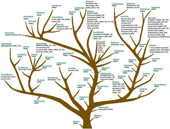 Evolutionary Tree of Plant-Derived Small Molecule Inhibitors. Adapted from [,] and supplemented with natural products with protein kinase-inhibiting properties using information from the literature [,,,,,,,,,,,,,,]. Phytochemicals indicate only the botanical families where they were first discovered from. Other families still contain compounds identified but are not an original source (CINOS). More information is available in Supplementary Table S4.