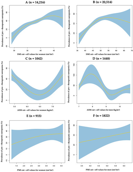 Non-parametric regression via smoothing splines for assessing the relationship between prevalence of pre-therapeutic sarcopenia and cut-off values of SMI (A,B), ASM (C,D), or PMI (E,F) in women and men with cancer, respectively.