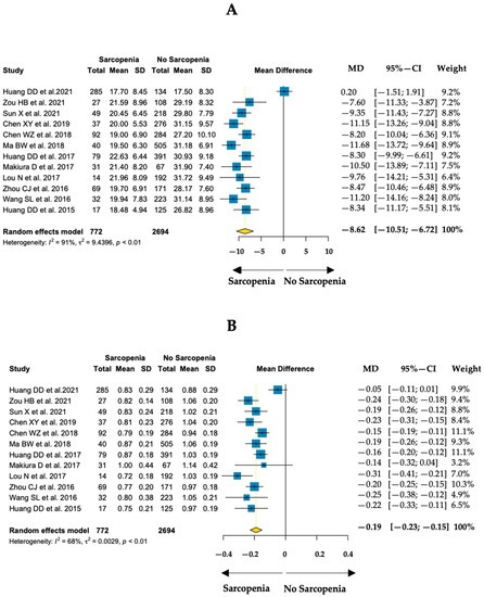 Twelve studies including 3466 patients provided data on muscle strength and physical performance. Handgrip strength values among sarcopenic patients ranged from 17.7 to 22.6 kg and gait speed values among sarcopenic patients ranged from 0.72 to 1.00 m/s [26,51,58,111,138,145,169,177,179,187,206,216]. Figure 2 summarizes the mean differences in handgrip strength and gait speed between sarcopenic and non-sarcopenic patients.