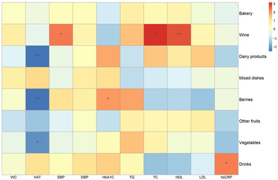 Association between different self-reported food groups and cardiometabolic risk factors in the DCH-NG MAX study (n = 624, k = 1351). Standardized coefficients according to linear mixed models with random intercepts adjusting for age, sex, and BMI. * p < 0.05, ** p < 0.01. n = number of subjects, k = total number of observations. TG, triglycerides; SBP, systolic blood pressure; DBP, diastolic blood pressure; WC, waist circumference; HbA1c, hemoglobin A1c; hsCRP, high-sensitivity C-reactive protein; VAT, visceral adipose tissue; TC, total cholesterol; HDL, high-density lipoproteins; TC, total cholesterol; LDL, low-density lipoproteins.