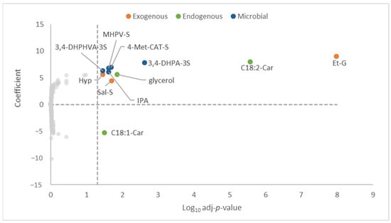 Association between metabolome biomarkers and total intake of ACNs. Censored regression for panel data adjusting for age, sex, and BMI (n = 624, k = 1351). p-values were calculated and adjusted by Benjamini–Hochberg procedure. Adjusted p-values < 0.05 were considered statistically significant. Hyp, hypaphorine; Sal-S, salsolinol sulfate; Et-G, ethyl glucuronide; 4-Met-Cat-S, 4-methylcatechol sulfate; MHPV-S, 4′-hydroxy-3′-methoxyphenyl-γ-valerolactone sulfate; 3,4-DHPHVA-3S, 5-(4-hydroxy(3,4-dihydroxyphenyl)-valeric acid sulfate; 3,4-DHPA-3S, 3,4-dihydroxyphenylacetic acid sulfate; IPA, indolepropionic acid; C18,2-Car, linoleoyl carnitine; C18,1-Car, oleoyl carnitine.