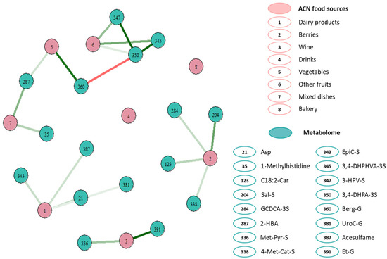 First-order neighborhood of ACNs intake related to different self-reported food groups with plasma metabolome biomarkers according to Mixed Graphical Models in the DCH-NG MAX study (n = 624, k = 1351). Edge intensity reflects the strength of the association from strong direct (dark green) to strong inverse association (dark red). Variables included in the mixed graphical model were ACN intake related to self-reported intake of dairy, berries, wines, non-alcoholic drinks (smoothies and fruit juices), vegetables, other fruits, mixed dishes, and bakery, and all the 408 plasma metabolites quantified with our targeted metabolomics method. n = number of subjects, k = total number of observations. For a detailed list of foods within each category go to Supplementary Table S1. Asp, asparagine; EpiC-S, epicatechin sulfate; UroC-G, urolithin C-glucuronide; GCDCA-3S, glycochenodeoxycholic 3-sulfate; Sal-S, salsolinol sulfate; 4-Met-Cat-S, 4-methylcatechol sulfate; C18:2-Car, linoleoyl carnitine; 2-HBA, 2-hydroxybenzoic acid; Berg-G, bergaptol glucuronide; Met-Pyr-S, methylpyrogallol sulfate; 3-HPV-S, 5-(3′-hydroxyphenyl)-γ-valerolactone 3’-sulfate; 3,4-DHPHVA-S, 5-(4-hydroxy(3,4-dihydroxyphenyl)-valeric acid sulfate; 3,4-DHPA-3S, 3,4-dihydroxyphenylacetic acid sulfate; Et-G, ethyl glucuronide.