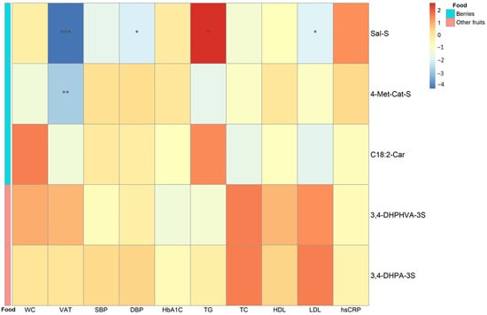Metabolites associated with ACN intake in both of the previous analyses were: salsolinol sulfate, 4-methylcatechol sulfate, linoleoyl carnitine, 3,4-DHPHVA-3S, and 3,4-DHPA-S. Figure 4 shows the associations between these metabolites and cardiometabolic risk factors. Out of the metabolites associated with berries’ ACNs, salsolinol sulfate and 4-methylcatechol sulfate were inversely associated with visceral adipose tissue volume. In addition, inverse associations were also found between salsolinol sulfate and LDL-C and diastolic blood pressure. Conversely, there was a direct association between salsolinol sulfate and triglyceride levels (Figure 4). Linoleoyl carnitine, 3,4-DHPHVA-3S, 3,4-DHPA-S did not show any statistically significant association with cardiometabolic risk factors.