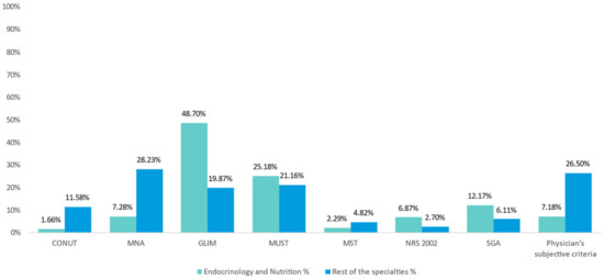 The tool employed to evaluate patient malnutrition by endocrinologists and nutritionists vs. the rest of the specialists (digestive, geriatrics, hematology, internal medicine, medical oncology, radiation oncology and others).