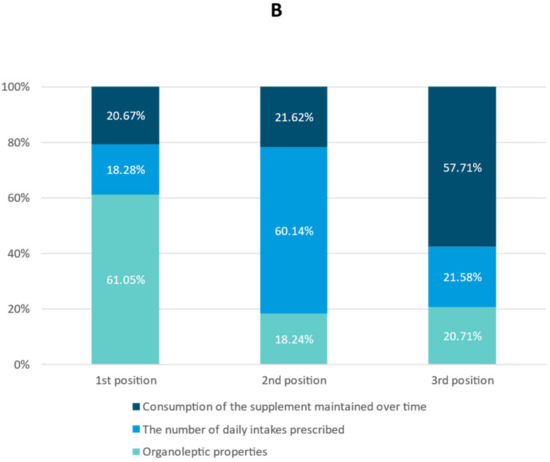 (A) Which of these organoleptic properties: smell, flavor or texture, has the most influence on adherence to the nutritional supplement? (B) Which of these options: organoleptic properties, the number of daily intakes prescribed or the consumption of the supplement maintained over time, has influenced ONS adherence most positively?