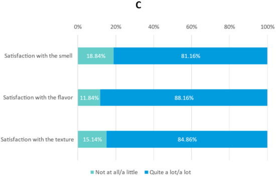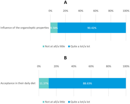 Moreover, most participants considered that the organoleptic properties influenced patient satisfaction ‘quite a lot’ or ‘a lot’ (90.42%) (Figure 4A) and that patients accepted the ONS in their daily diet ‘quite a lot’ or ‘a lot’ (88.63%) (Figure 4B).