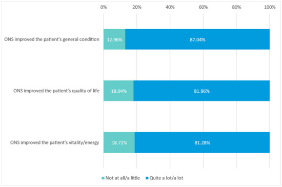 From the physicians’ perception, ONS contributed ‘quite a lot’ or ‘a lot’ to improving the patients’ general condition (87.04%), the patients’ QoL (81.96%) and the patients’ vitality/energy (81.28%) (Figure 5) (for all patients’ clinical improvement, see Table S3).