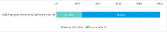 Finally, 75.57% of participants indicated that the diabetes-specific hypercaloric, high-protein ONS with high MUFA contributed to better glycemic control ‘quite a lot’ or ‘a lot’ (Figure 8).