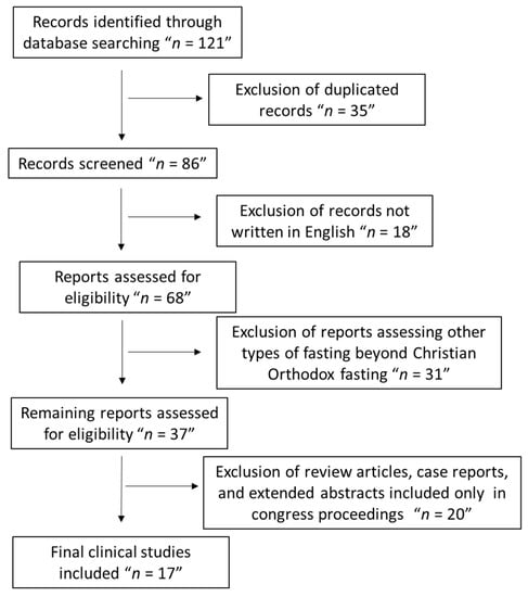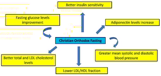 - Koufakis, T.; Karras, S.; Antonopoulou, V.; Angeloudi, E.; Zebekakis, P.; Kotsa, K. Effects of Orthodox religious fasting on human health: A systematic review. Eur. J. Nutr. 2017, 56, 2439–2455. [Google Scholar] [CrossRef] [PubMed]