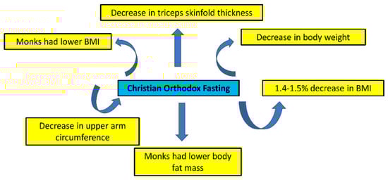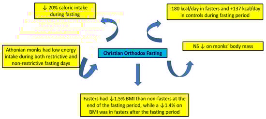 | 120 Greek adults were followed longitudinally (60 fasters, 60 non-fasters) | 1 year | Fasters had a ↓ 1.5% BMI than non-fasters at the end of the fasting period, while a ↓ 1.4% on BMI was in fasters after the fasting period | [17] |