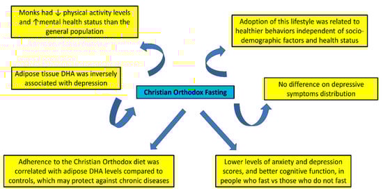 - Spanaki, C.; Rodopaios, N.E.; Koulouri, A.; Pliakas, T.; Papadopoulou, S.K.; Vasara, E.; Skepastianos, P.; Serafeim, T.; Boura, I.; Dermitzakis, E.; et al. The Christian Orthodox Church Fasting Diet Is Associated with Lower Levels of Depression and Anxiety and a Better Cognitive Performance in Middle Life. Nutrients 2021, 13, 627. [Google Scholar] [CrossRef]