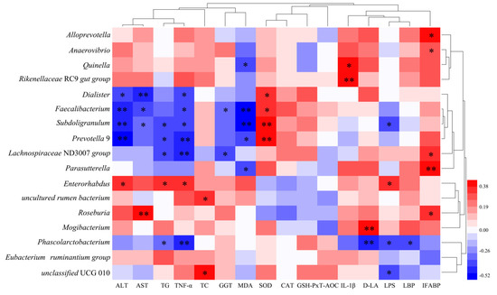 3.10. Correlation of Differential Bacterial Genera with Biochemical Indicators