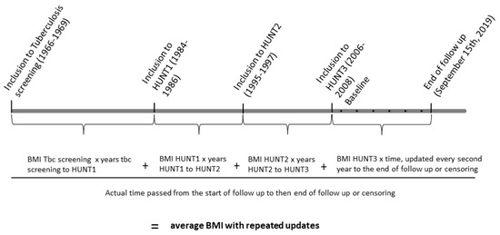We denoted the BMI values at the four time points here as BMI67 (obtained from the tuberculosis screening program conducted in 1966–1969), BMI85 (HUNT1 conducted in 1984–86), BMI96 (HUNT2 conducted in 1995–1997) and BMI07 (HUNT3 conducted in 2006–2008). We estimated the average BMI from BMI67 to the end of the follow-up period by taking the different follow-up times due to censoring into account. Therefore, we updated the time and the average BMI after baseline every other year (See the graphical presentation of the study setup and the formula in Figure 1). By doing so, the length of the follow-up period had less influence on the average BMI, and censored participants became more comparable to the uncensored participants.