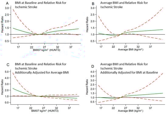 (A to D): Cubic Splines of BMI at Baseline or Average BMI (BMI67-07) and HR of Ischemic Stroke. All Splines are Adjusted for Covariates of Model 2. (C) is Additionally Adjusted for Average BMI (BMI67-07) and (D) for the Most Recent BMI from Baseline HUNT3.