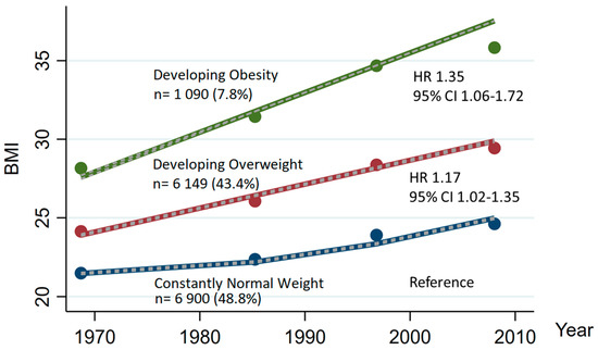 We identified three groups based on the trajectories of BMI development, and these groups were also included in our Cox models with consistent normal weight as the reference group.