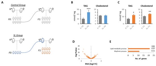 We have developed a mouse model of early adiposity (i.e., childhood obesity) and long-term metabolic dysfunction through litter size reduction at birth (Figure 1A) [14,15]. Mice reared in small litters (SL-F0) developed hepatic steatosis (increased hepatic triglyceride content) as adults (Figure 1B). The offspring of SL mice (SL-F1, from now onward) also developed glucose intolerance and insulin resistance [18]. Furthermore, here, we confirmed that SL-F1 mice also accumulated greater levels of hepatic triglycerides and cholesterol when compared to the controls (Figure 1C).