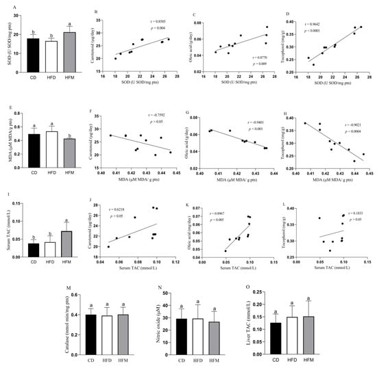 Oxidative stress level and antioxidant capacity of mice after consuming the experimental diets for 8 weeks, and correlation with carotenoid, oleic acid, and tocopherol intakes. (A) Superoxide dismutase level. (B) Correlation between SOD level and carotenoid intake. (C) Correlation between SOD level and oleic acid intake. (D) Correlation between SOD level and tocopherol intake. (E) Malondialdehyde level. (F) Correlation between MDA level and carotenoid intake. (G) Correlation between MDA level and oleic acid intake. (H) Correlation between MDA level and tocopherol intake. (I) Serum total antioxidant capacity level. (J) Correlation between serum TAC level and carotenoid intake. (K) Correlation between serum TAC level and oleic acid intake. (L) Correlation between serum TAC level and tocopherol intake. (M) Catalase level. (N) Nitric oxide level. (O) Liver total antioxidant capacity level. Data are expressed as mean ± standard deviation (n = 10). Different letters indicate a statistical difference based on the Newman–Keuls test (p ≤ 0.05). CD: control diet—AIN93M; HFD: high-fat diet; HFM: high-fat diet with macauba pulp oil; SOD: superoxide dismutase; MDA: malondialdehyde; TAC: total antioxidant capacity.