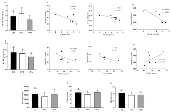 Levels of proteins in the adipose tissue (A–H) and liver (I–K) of mice after consuming the experimental diets for 8 weeks, and correlation with carotenoid, oleic acid, and tocopherol intakes. Data are expressed as mean ± standard deviation (n = 8). Different letters indicate a statistical difference based on the Newman–Keuls test (p ≤ 0.05). CD: control diet—AIN93M; HFD: high-fat diet; HFM: high-fat diet with macauba pulp oil; NF-κB p65: nuclear factor kappa B subunit p65; PPAR-α: peroxisome proliferator-activated receptor alpha; PPAR-γ: peroxisome proliferator-activated receptor gamma; TLR-4: toll-like receptor 4.