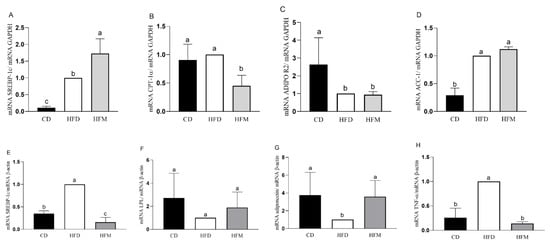 Gene expression in the liver (A–D) and adipose tissue (E–H) of mice after consuming the experimental diets for 8 weeks. Data are expressed as mean ± standard deviation (n = 8). Different letters indicate a statistical difference based on the Newman–Keuls test (p ≤ 0.05). CD: control diet—AIN93M; HFD: high-fat diet; HFM: high-fat diet with macauba pulp oil; SREBP-1c: sterol regulatory element-binding proteins 1c; ADIPOR2: adiponectin receptor 2; ACC-1: acetyl CoA carboxilase 1; CPT-1α: carnitine palmitoyl transferase 1 alpha; GAPDH: glyceraldehyde-3-phosphate dehydrogenase; LPL: lipoprotein lipase; TNF-α: tumor necrosis factor alpha.