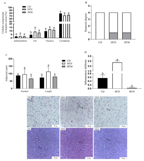 Cellular components: percentage in hepatic tissue (A), steatosis degree (B), number and length of adipocyte (C), and inflammatory infiltrate (D). The black arrows represent the following: z: cytoplasm, f: fat vesicles, n: nucleus, p: inflammatory infiltrate, and r: adiposity. Data are expressed as mean ± standard deviation (n = 10). Different letters indicate a statistical difference based on the Newman–Keuls test (p ≤ 0.05). CD: control diet; HFD: high-fat diet; HFM: high-fat diet with macauba pulp oil.