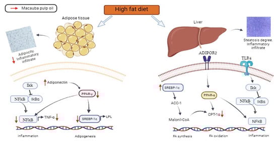 The influence of a high-fat diet on the body and the mechanism of macauba pulp oil, which was demonstrated in our study, are summarized in Figure 5. The consumption of macauba pulp oil prevents inflammation and adipogenesis, as demonstrated by a reduction in the expression of PPAR-γ, (mRNA) SREBP-1c, NF-κB, and (mRNA) TNF-α, and an increase in adiponectin in adipose tissue. In the liver, despite triggering the SREBP-1c expression and a lower (mRNA) CPT-1α level, it does not lead to liver changes, according to the histomorphometric analysis, due to an increased antioxidant capacity. These modes of action may be related to macauba pulp oil, which has a good composition of carotenoids, oleic acid, and tocopherol and improves the total antioxidant capacity, resulting in adipogenesis even with a high level of saturated fat consumption.