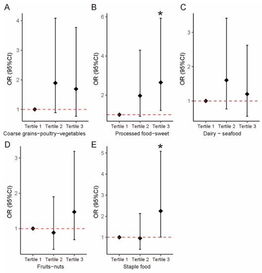 Association between the tertiles dietary patterns and the risk of ADHD. (A) Coarse grains–poultry–vegetables. (B) Processed food–sweets. (C) Dairy–seafood. (D) Fruits–nuts. (E) Staple food. Solid diamonds and horizontal lines indicate OR and 95% CI, respectively. * p < 0.05.
