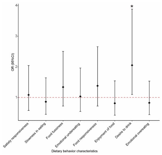 Association between the median-based groups of eating behavior characteristics and the risk of ADHD. Solid diamonds and horizontal lines indicate OR and 95% CI, respectively. * p < 0.05.