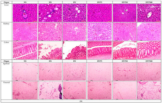 (A) The histopathological changes in liver, kidney, colon, RpWAT, and visceral fat tissue of male offspring of PND 21. HS shows abnormal strands of hepato-cytes (H), sinusoids (S), and central veins (CVs). Cell ballooning, steatosis, and >30% of lobular inflammation were seen. The liver histology in the HY group shows abnormal hepatocytes, sinusoids, and CVs with hepatocyte ballooning with lipid droplets. There is no presence of steatosis or lobular inflammation in the HY group. The liver histology for male offspring of the NS, HYT5, HYT50, and HYT500 groups shows a completely normal architecture. The kidneys of male offspring of the HS and HY groups show slight tubular dilation, the presence of abnormal lesions, and slight abnormalities of the renal corpuscle, while the liver histology for male offspring of the NS, HYT5, HYT50, and HYT500 groups shows a completely normal architecture. The colons in male offspring of the HS and HY groups show a detachment of epithelial cells, reduced mucosal content in the colonic wall, severe infiltration in the lamina propria, the presence of inflammation, and fat deposition in the muscle layer. The colon structure of the male offspring in the HYT5, HYT50, and HYT500 groups shows a completely normal architecture. There is severe fat hypertrophy in male offspring of the HS group in retroperitoneal white adipose tissue (RpWAT) and visceral fat tissue. (B) The histopathological changes in liver, kidney, colon, RpWAT, and visceral fat tissue of female offspring on PND 21. HS shows abnormal strands of hepatocytes (H), sinusoids (S), and central veins (CVs). Cell ballooning, steatosis, and >30% lobular inflammation were seen. The liver histology in the HY group shows abnormal hepatocytes, S, and CVs with hepatocyte ballooning with lipid droplets. There was no presence of steatosis or lobular inflammation in the HY group. The liver histology for female offspring of the NS, HYT5, HYT50, and HYT500 groups showed a completely normal architecture. The kidneys of female offspring in the HS and HY groups showed slight tubular dilation, the presence of abnormal lesions, and slight abnormalities of the renal corpuscle. The liver histology for female offspring in the NS, HYT5, HYT50, and HYT500 groups showed a completely normal architecture. The colons in female offspring in the HS and HY groups showed a detachment of epithelial cells, reduced mucosal content in the colonic wall, severe infiltration in the lamina propria, the presence of inflammation, and fat deposition in the muscle layer. The colon structure of the female offspring in the HYT5, HYT50, and HYT500 groups shows a completely normal architecture. Severe fat hypertrophy was present in female offspring of the HS group, being observed in retroperitoneal white adipose tissue (RpWAT) and visceral fat tissue. The arrow symbols refer to the fat hypertrophy.