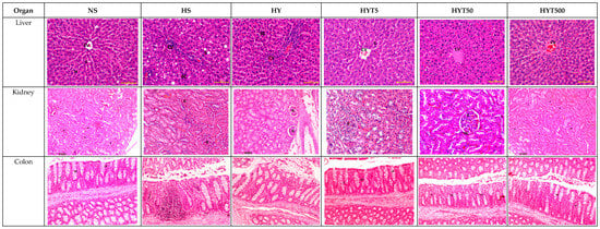 Table 2 shows the liver profiles of the male and female offspring on PND 21. As shown in Table 2, there is no significant difference (p > 0.05) between the NS, HS, HY, HYT5, HYT50, and HYT500 groups in the total protein content of the male offspring. The plasma content of the globulin–albumin ratio, ALP, AST, ALT, and GGT is significantly higher (p < 0.05) in the male offspring in the HS group compared to the NS group, while there is no significant difference (p > 0.05) in plasma albumin content between the HS and NS groups. Meanwhile, the plasma concentration of albumin and bilirubin is significantly lower (p < 0.05) in the male offspring in the HS group compared to the NS group. In the male offspring in the HY group, there is no significant difference (p > 0.05) in plasma albumin, globulin, ALT, GGT, and bilirubin compared to the HS group. The mean value of the male offspring for albumin, globulin, the albumin–globulin ratio, and AST shows no significant difference (p > 0.05) compared to the NS group. However, the plasma content of ALP for the male offspring is significantly higher (p < 0.05) compared to the NS group, while significantly lower (p < 0.05) compared to the HS group. In the male offspring in the HYT5, HYT50, and HYT500 groups, the plasma content of albumin, the albumin–globulin ratio, AST, GGT, and bilirubin shows a significant reduction (p < 0.05) compared to the HS group, while no significant difference (p > 0.05) is observed compared to the NS group. The albumin content of the male offspring in the HYT50 group shows no significant difference (p > 0.05) compared to the HS group, while the HYT5 and HYT50 groups show no significant (p > 0.05) difference in plasma globulin content compared to the HS group. There is no significant difference (p > 0.05) between the HYT5, HYT50, and HYT500 groups for ALP content in male offspring; however, ALP is significantly lower (p < 0.05) compared to the HS group, while it is significantly higher (p < 0.05) compared to the NS, HYT50, and HYT500 groups. The mean value for ALP content in the male offspring in the HYT5 group is similar to the NS group, while the mean value for the HYT500 group is similar to the HY group. For ALT, the male offspring in the HYT5 group shows a similar mean value to the NS group, the HYT50 group shows a similar mean value to the HS group, while the HYT500 group shows a similar mean value to the HY group. There is no significant (p > 0.05) difference in plasma ALT content in the male offspring in the HYT5 and HYT500 groups. For the plasma concentration of GGT, the male offspring in the HYT5, HYT50, and HYT500 groups show no significant (p > 0.05) difference compared to the NS group. There is no significant (p > 0.05) difference in the male offspring in the HYT50 group compared to the HY and HYT500 groups compared to the HS and HY groups for plasma concentration of GGT. As shown in Table 2, there is no significant difference (p > 0.05) between the NS, HS, HY, HYT5, HYT50, and HYT500 groups in the total protein content of the female offspring. The plasma content of albumin and total bilirubin is significantly lower (p < 0.05) in the female offspring in the HS group compared to the NS group, while the levels of globulin, the albumin–globulin ratio, ALP, AST, ALT, and GGT are significantly higher (p < 0.05) in the female offspring in the HS group compared to the NS group. In the female offspring in the HY group, the levels of globulin, the albumin–globulin ratio, ALT, AST, ALP, GGT, and bilirubin show no significant difference (p > 0.05) compared to the HS group. However, the mean values of GGT and ALT for the female offspring in the HY group show no significant difference (p > 0.05) compared to the NS group. The mean value of albumin is significantly higher (p < 0.05) compared to the HS group while significantly lower (p < 0.05) compared to the NS group. Meanwhile, the level of the albumin–globulin ratio is significantly higher (p < 0.05) compared to the NS group. For all female offspring in the HY, HYT50, and HYT500 groups, the plasma concentration of albumin, globulin, the albumin–globulin ratio, ALT, AST, ALP, GGT, and total bilirubin shows no significant difference (p > 0.05) compared to the NS group. In this, the mean values of total bilirubin and globulin in the HYT5, HYT50, and HYT500 groups show no significant difference (p > 0.05) compared to the HS group. The mean values of albumin and the albumin–globulin ratio in the female offspring in the HYT50 and HYT500 groups is similar to the HY group, while the mean value of albumin in the female offspring in the HYT500 group shows no significant difference (p > 0.05) compared to the HS group.