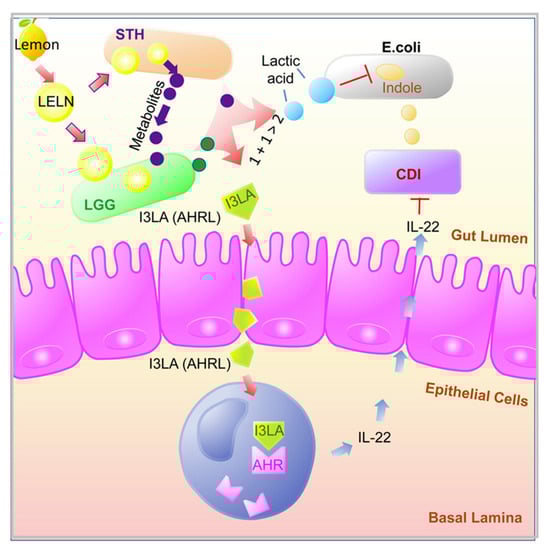 As it is shown in Figure 1, this probiotic mix (LGG and STH) previously treated with LELNs increases on the one hand, the AhR ligands indole-3-lactic acid (I3LA) and indole-3-carboxaldehyde (I3Ald), leading to induction of IL-22, and on the other hand, lactic acid, which leads an inhibition of Clostridioides difficile. Moreover, metabolites from STH can inhibit the LGG gluconeogenesis pathway to increase the production of I3LA and lactic acid when co-culturing these two strains, thus exhibiting a synergistic effect in protecting against Clostridioides difficile infection [].