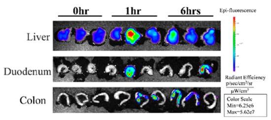 The distribution and absorption of DIR-TBDNs in the liver, duodenum, and colon. (Reprinted with permission from Liu Y et al. [] Copyright 2023 American Chemical Society).