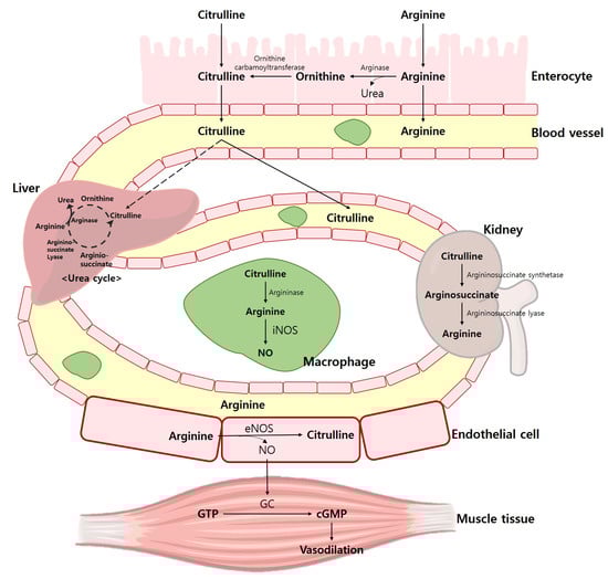 Arg has been shown to enhance physical performance [,,,], vascular endothelium function [,,,], and sexual function [,]. Additionally, it is a conditionally essential AA that plays a role in various physiological processes. Therefore, a substantial amount of Arg is required to perform various physiological functions, and a significant amount of ingested Arg (~40%) is decomposed in the intestine while the remainder is transported to the liver where it is metabolized into urea [,,]. Arg increases NO production and draws attention from athletes as having a potential ergogenic advantage [], since Arg might be able to generate NO through nitric oxide synthase (NOS) []. The endogenous synthesis of NO occurs through a process in which Arg is metabolized into Cit by NOS []. Arg is also an important precursor for the production of NO. Argininosuccinate lyase and argininosuccinate synthase in the liver recycles Cit into Arg to produce a Cit-Arg cycle that produces NO []. The pathways of NOS include neural nitric oxide synthase (nNOS), cytokine-induced nitric oxide synthase (iNOS), and endothelial nitric oxide synthase (eNOS) []. In skeletal muscle, nNOS is the predominant isoform and regulates blood flow and glucose uptake during exercise. eNOS is primarily expressed in endothelial cells and produces nitric oxide in response to various stimuli, including physical activity. Details of NOS through the Arg pathway are shown in Figure 1.