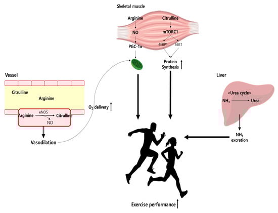 NO acts on a variety of physiological processes, such as vasodilation, mitochondrial respiration, glucose absorption, and muscle contraction [,,]. The roles NO plays in the human body are related to the improvement of exercise performance [,,,]. Therefore, nitrites and nitrates are generally used to quantify plasma NO concentrations, and it is most important to maintain physiologically appropriate NO concentrations for skeletal muscle health []. Figure 2 illustrates the Arg and Cit pathway in exercise performance.