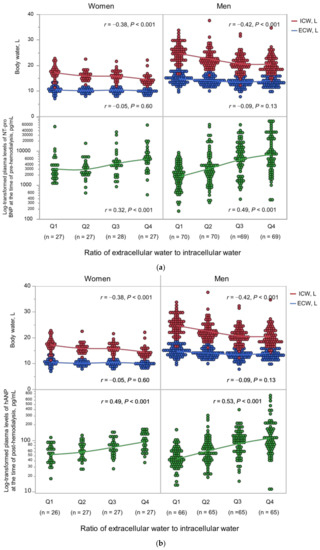 Body fluid composition and log10-transformed natriuretic peptide levels according to the ECW/ICW ratio quartiles are shown in Figure 1. The ECW/ICW ratio had a significant negative correlation with the ICW content (men: r = −0.42 in men, p < 0.001; women: r = −0.38, p < 0.001), but not with the ECW content (men: r = −0.05, p = 0.60; r = −0.09, p = 0.13). Thus, the ECW/ICW ratio was primarily derived from decreased intracellular volume and not excess extracellular volume. The ECW/ICW ratio had significant positive correlations with the log10-transformed NT-proBNP (men: r = 0.49, p < 0.001; women: r = 0.32, p < 0.001) and log10-transformed hANP (men: r = 0.53, p < 0.001; women: r = 0.49, p < 0.001). The correlations between the ECW/ICW ratio, ECW per BSA, ICW per BSA, and log10-transformed natriuretic peptides are shown in Figure 2. In comparison to the ECW per BSA or ICW per BSA, the ECW/ICW ratio had a stronger correlation with the log10-transformed natriuretic peptides.