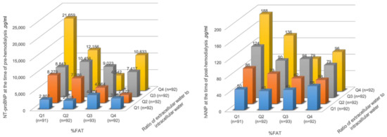Association between body fluid imbalance and natriuretic peptides according to the fat percentage quartiles. NT-proBNP, pre-dialysis N-terminal pro-B-type natriuretic peptide; hANP, post-dialysis human atrial natriuretic peptide; Q1, Quatile1; Q2, Quatile2; Q3, Quatile3; Q4, Quatile4.