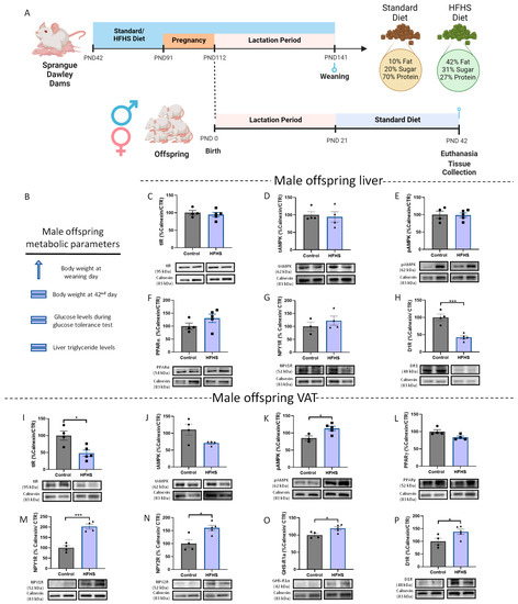 Female Sprague-Dawley rats were fed an HFHS diet (containing 42% metabolizable energy from fat, 27% from proteins, and 31% from carbohydrates) before pregnancy until lactation. At PND 21, newborns were weaned and fed with chow. At PND 42, male and female offspring were euthanized, and peripheral tissues were collected for molecular and cellular analysis. In this study, liver and visceral AT (VAT) samples were used from a previously published study, where the experimental design (Figure 1A) and all the biochemical profiles of the rats with 42 days were already described (control litters = 6; HFHS litters = 6; number of males from control dams = 4; number of males from dams submitted to HFHS diet = 5; number of females from control dams = 4; number of females from dams submitted to HFHS diet = 5). More information about this animal model is available in Stevanović-Silva et al. [49,50]. The results of this animal model are depicted in Figure 1 and Figure 2.