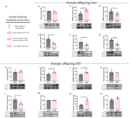 Maternal DIO female offspring were also studied to assess a potential sexual dimorphism in the liver and VAT adaptation to the maternal metabolic state. As occurs in males, maternal obesity increased female offspring body weight until weaning day (in summary in Figure 2A) (previously published [49]). Similar to male livers, there were no alterations in total IR levels (Figure 2B), and a significant reduction in D1R (Figure 2G) in female offspring exposed to the maternal HFHS diet during the perinatal period was observed (p < 0.001 vs. control). Nevertheless, in female offspring livers, NPY1R, PPARα, and p-AMPK levels also decreased (p < 0.05 vs. control, p < 0.05 vs. control, and p < 0.05 vs. control, respectively) (Figure 2D–F, respectively), while total levels of AMPK increased (p < 0.05 vs. control) (Figure 2C), showcasing the disparity between sexes.