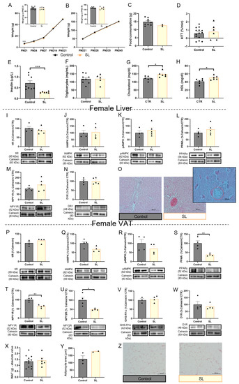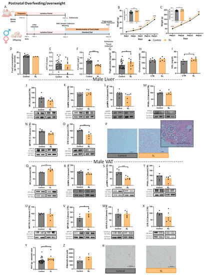 On the third day after the birth, a small litter (SL) protocol was implemented by reducing the litter size to 3 pups per dam to induce postnatal overfeeding and overweight (Figure 3A) (control litters = 7; SL litters = 5; number of males from normal litters (NL) = 35; number of males from SL = 9; number of females from NL = 12; number of females from SL = 6). The results of this animal model are depicted in Figure 3 and Figure 4.