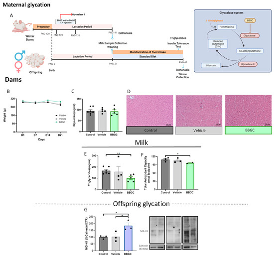 The glycation induced by BBGC (5 mg/kg) through IP did not alter the body weight or glycemic profile of dams (Figure 5B,C, respectively). Furthermore, BBGC did not cause toxicity in the liver (Figure 5D). However, glycation changed breastmilk quality, decreasing triglyceride levels (p < 0.01 vs. control) and total antioxidant capacity (p < 0.05 vs. control) (Figure 5E,F, respectively). A known methylgyoxal-derived AGE is N-(5-hydro-5-methyl-4-imidazolon-2-yl)-ornithine (MG-H1) [52]. This compound was increased in VAT from male offspring exposed to maternal glycotoxins (p < 0.05 vs. control; p < 0.05 vs. vehicle) (Figure 5G), showing that inhibition of glyoxalse I in dams leads to AGEs accumulation in VAT offspring.