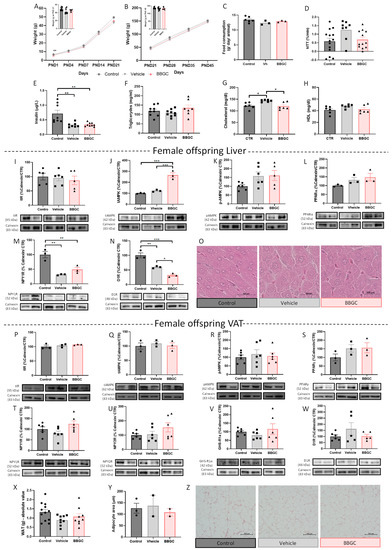 As well as in the male offspring, during the lactation period and after weaning, no alteration in body weight of females exposed to maternal glycation (Figure 7A,B) or liver weight (supplementary data—Figure S1D) was observed. Contrary to what was observed in male offspring, food intake was not affected in BBGC female offspring (Figure 7C). Furthermore, no changes in kITT were observed in female offspring (Figure 7D), suggesting that male offspring are more susceptible to alteration in insulin sensitivity and feeding regulation when exposed to the same maternal condition. Although plasma insulin levels in BBGC female offspring were decreased (p < 0.01 vs. control), this was also observed in the vehicle group (p < 0.01 vs. control) (Figure 7E). Triglyceride (Figure 7F) and HDL (Figure 7H) levels were also unaltered between groups, while cholesterol levels were affected by vehicle (p < 0.05 vs. control; p < 0.05 vs. BBGC) (Figure 7G). Total IR levels were also maintained in both the liver and WAT of female offspring (Figure 7I,P, respectively).