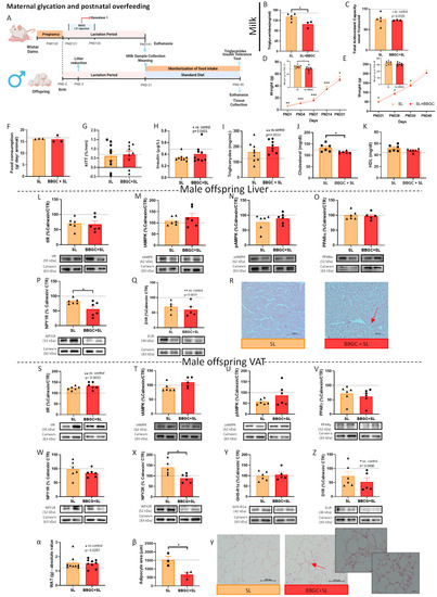 BBGC also reduced milk triglyceride levels (p < 0.05 vs. SL) and total antioxidant capacity (p < 0.05 vs. control) in SL dams (Figure 8B,C, respectively). Exposure to maternal glycation during lactation prevented male offspring weight gain induced by postnatal overfeeding from PND14 to PND35 (p < 0.05 vs. SL) (Figure 8D,E). No alterations were observed in food intake or the kITT (Figure 8F,G, respectively) or in the liver weight (supplementary data—Figure S1E) in the BBGC + SL group as occurs in SL animals with healthy motherhood. The alterations in plasma insulin (p < 0.05 vs. control) (Figure 8H) and triglyceride (p < 0.05 vs. control) (Figure 8I) levels observed in SL males were maintained in SL + BBGC offspring. Cholesterol levels were reduced in SL rats exposed to maternal glycation (p < 0.05 vs. SL) (Figure 8J), while the increase in HDL-cholesterol levels observed in male SL was not noticed when the animals were exposed to glycotoxins (Figure 8K). Total IR levels were maintained in the liver and VAT of male SL + BBGC offspring compared to SL (Figure 8L,S, respectively), and its upregulation in the liver of SL males was maintained in relation to control rats.