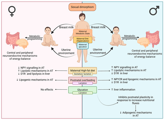 Hypothetical effects of obesogenic environments (hypercaloric diet, postnatal overfeeding, and maternal glycation) on human energy balance mechanisms depending on sexual dysmorphism observed in rat models (created with BioRender.com, accessed on 25 January 2023).