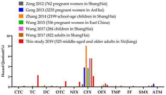 - Wang, H.; Wang, N.; Qian, J.; Hu, L.; Huang, P.; Su, M.; Yu, X.; Fu, C.; Jiang, F.; Zhao, Q.; et al. Urinary antibiotics of pregnant women in Eastern China and cumulative health risk assessment. Environ. Sci. Technol. 2017, 51, 3518–3525. [Google Scholar] [CrossRef]