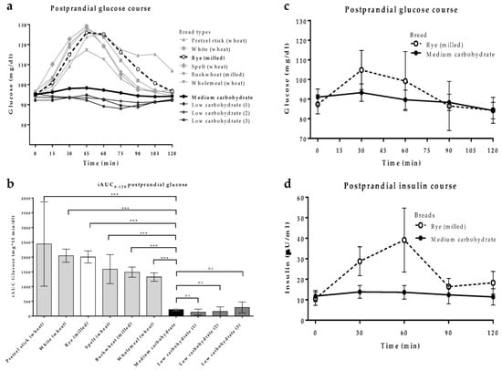 Postprandial glucose and insulin responses in the pre-tests. Participants (n = 6) consumed 50 g of ten different study breads on separate days after an overnight fast. (a) Mean glucose values measured by continuous glucose monitoring and (b) corresponding area under the curve for 0–120 min (mean ± SD). Mann–Whitney test was used for determining inter-group differences, *** p < 0 001. Participants (n = 6) consumed 50 g of the milled whole grain rye bread and of the medium-carbohydrate bread on consecutive days after an overnight fast and venous blood was collected every 30 min for 120 min. (c) Postprandial course of mean ± SEM blood glucose levels and (d) corresponding course of mean ± SEM blood insulin levels.