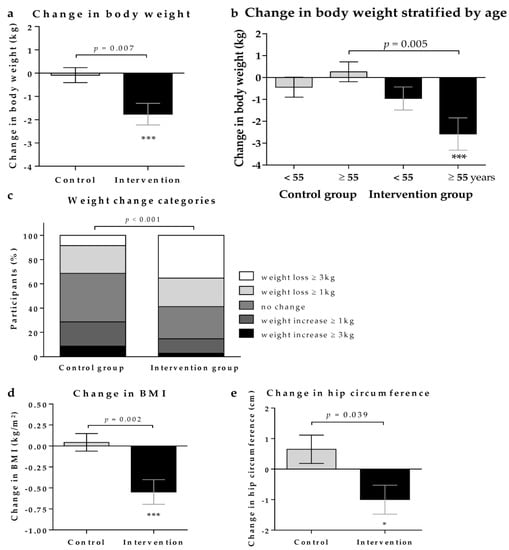 Effects on body weight, BMI and hip circumference. Changes in (a) body weight, (b) body weight stratified by the mean age of 55 years (d) BMI, and (e) hip circumference are shown as mean ± standard error of mean and compared using Mann–Whitney test for between-group differences and Wilcoxon signed rank test for within-group differences (* p < 0.05; *** p < 0.001); Chi-square test was used to analyse differences in (c) weight change categories between groups.