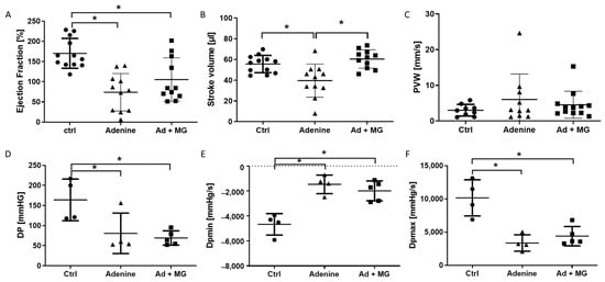 Decreased cardiac function was measured by echocardiography and Millar catheter at the end of the experiment. (A) Ejection fraction, (B) stroke volume, (C) pulse wave velocity (PVW) inside the common carotid artery, (D) left ventricular developed pressure (DP), (E) minimal developed pressure over time (Dpmin); and (F) maximal developed pressure over time (DPmax). Ad: adenine; Ctrl: control; MG: magnesium. * p < 0.05.