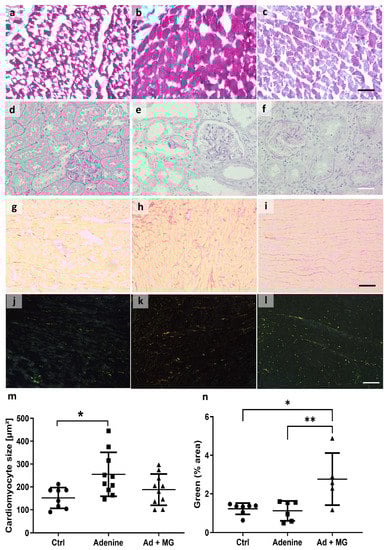 Histological analysis revealed cardiac hypertrophy but absent remarkable fibrosis in cardiac sections from adenine rats, whereas magnesium supplementation to the adenine diet increased green-emitting fibrils enhanced by polarized light after picrosirius red staining. (a) PAS staining in cardiac tissue from control rats; (b) PAS staining in cardiac tissue from adenine-fed rats; (c) PAS staining in cardiac tissue from adenine + magnesium-fed rats; (d) PAS staining in kidney tissue from control rats; (e) PAS staining in kidney tissue from adenine-fed rats; (f) PAS staining in kidney tissue from adenine + magnesium-fed rats; (g) picrosirius red staining in cardiac tissue from control rats, brightfield image; (h) sirius red staining in cardiac tissue from adenine-fed rats, brightfield image; (i) picrosirius red staining in cardiac tissue from adenine + magnesium fed-rats, brightfield image; (j) picrosirius red staining in cardiac tissue from control rats, polarized light; (k) picrosirius red staining in cardiac tissue from adenine-fed rats, polarized light; (l) picrosirius red staining in cardiac tissue from adenine + magnesium- fed rats, polarized light; (m) cardiomyocyte size, measured from PAS-stained sections (mean, SD); and (n) percentage of green-positive area in picrosirius-red-stained sections under polarized light (mean, SD). Scale = 50 µM; Ad: adenine; Ctrl: control; MG: magnesium. * p < 0.05, ** p < 0.01.