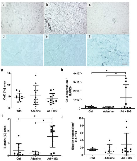 Cardiac immunohistochemistry presented an increase in elastin protein by magnesium supplementation to the adenine diet. (a) Collagen III staining in cardiac tissue from control rats; (b) collagen III staining in cardiac tissue from adenine-fed rats; (c) collagen III staining in cardiac tissue from adenine + magnesium-fed rats; (d) elastin staining in cardiac tissue from control rats; (e) elastin staining in cardiac tissue from adenine-fed rats; (f) elastin staining in cardiac tissue from adenine + magnesium-fed rats; (g) planimetric quantification of collagen III staining in heart tissue; (h) relative expression of collagen III mRNA to GAPDH, measured by semiquantitative real-time PCR; (i) planimetric quantification of elastin staining in hearts; (j) relative expression of elastin mRNA to GAPDH, measured by semiquantitative real-time PCR. Scale bar = 50 µM; Ad: adenine; Ctrl: control; MG: magnesium; *: p < 0.05.