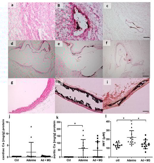 Von Kossa staining of aortas and hearts visualized an increase in soft tissue calcification with adenine diet. (a) Cardiac tissue from control rats; (b) cardiac tissue from adenine-fed rats; (c) cardiac tissue from adenine + magnesium-fed rats; (d) heart valves from control rats; (e) heart valves from adenine-fed rats; (f) heart valves from adenine + magnesium-fed rats; (g) aorta from control rats; (h) aorta from adenine-fed rats; (i) aorta from adenine + magnesium-fed rats; (j) total calcium content of cardiac tissue (mg/g) normalized to total cardiac protein; (k) total calcium content of aortic tissue (mg/g) normalized to total aortic protein; and (l) intima media thickness, measured in von Kossa-stained aortas. Scale bar = 50 µM; Ad: adenine; Ca: calcium Ctrl: control; MG: magnesium; *: p < 0.05.